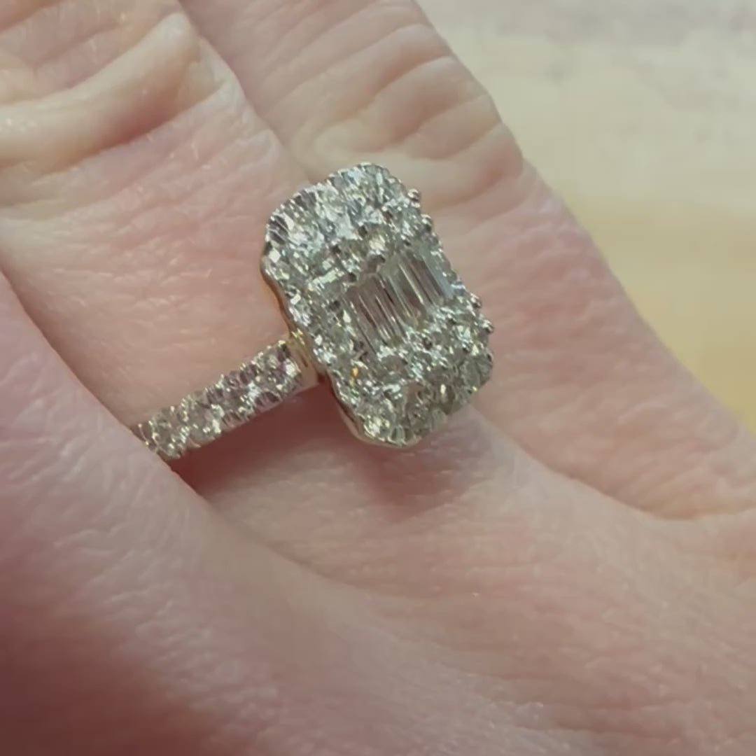 All diamonds are secured in a 9ct white gold claw setting. On a 9ct yellow gold band.