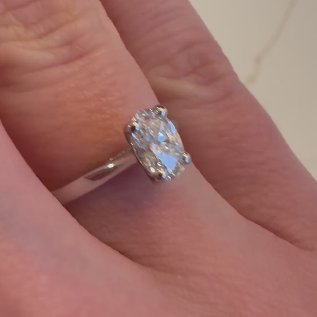 Beautiful platinum oval lab grown diamond ring set in a platinum claw setting on a plain polished band.