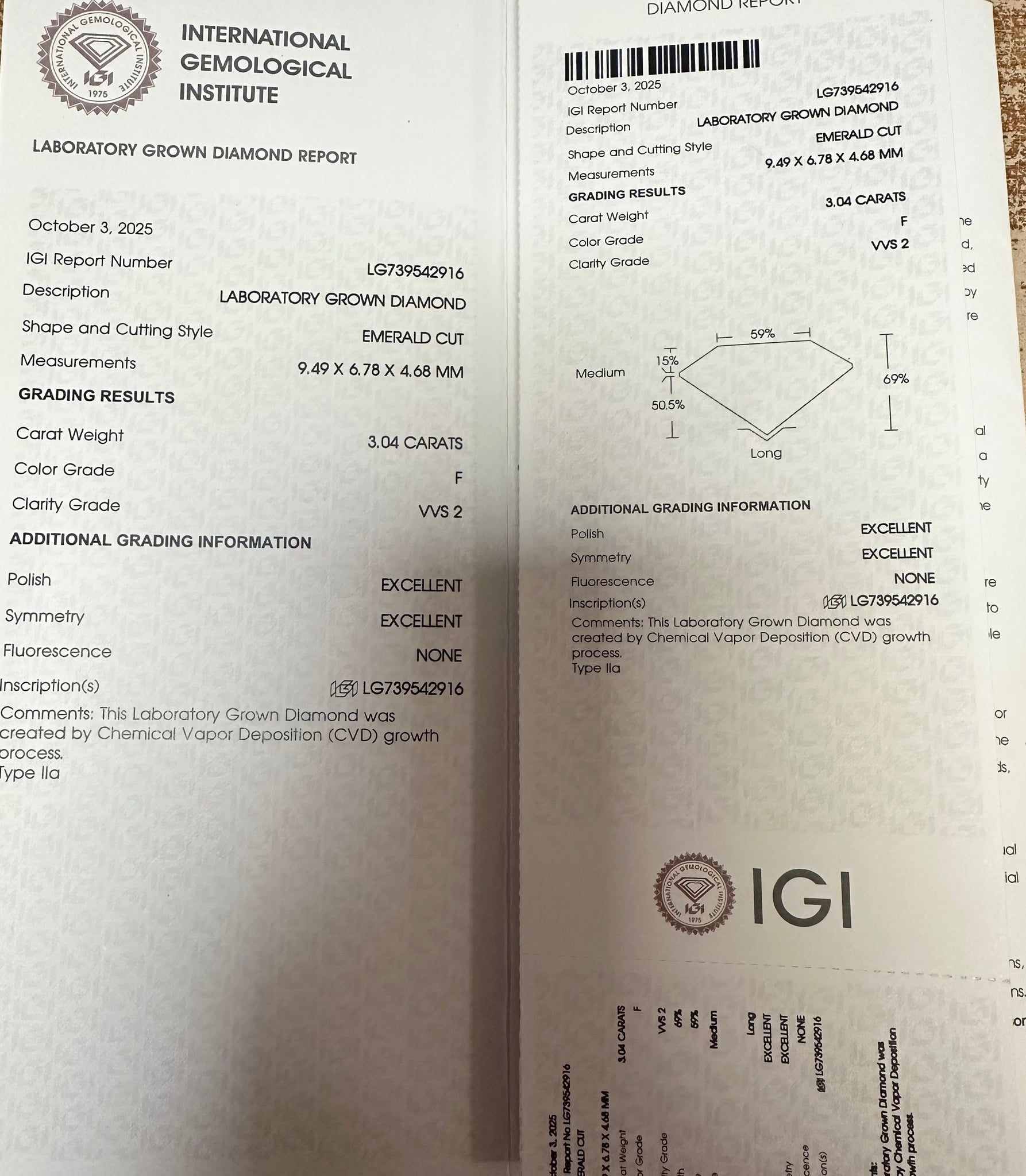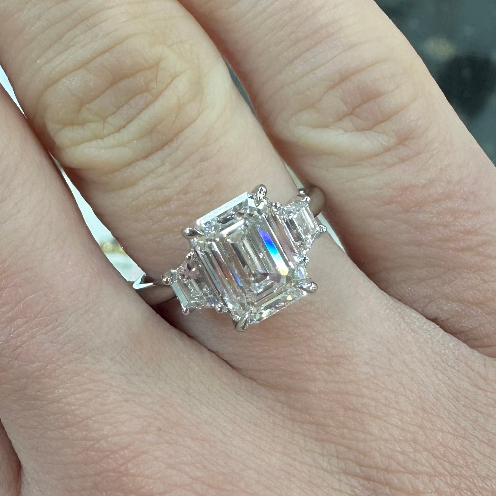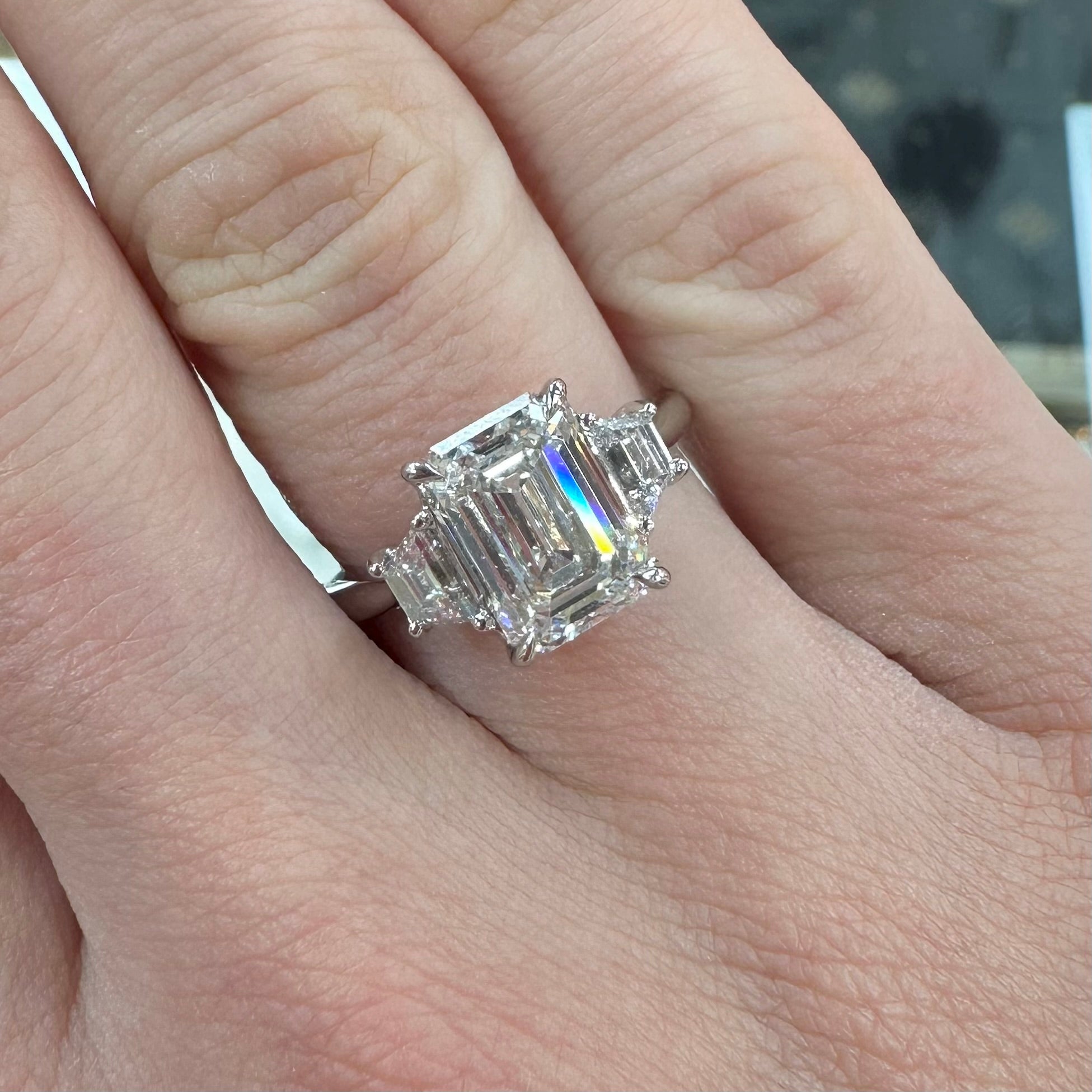 Beautiful platinum lab diamond 3 carat ring. The ring consists of a three stone lab diamond ring with a central lab emerald cut diamond, set in platinum claw setting on a plain polished band.