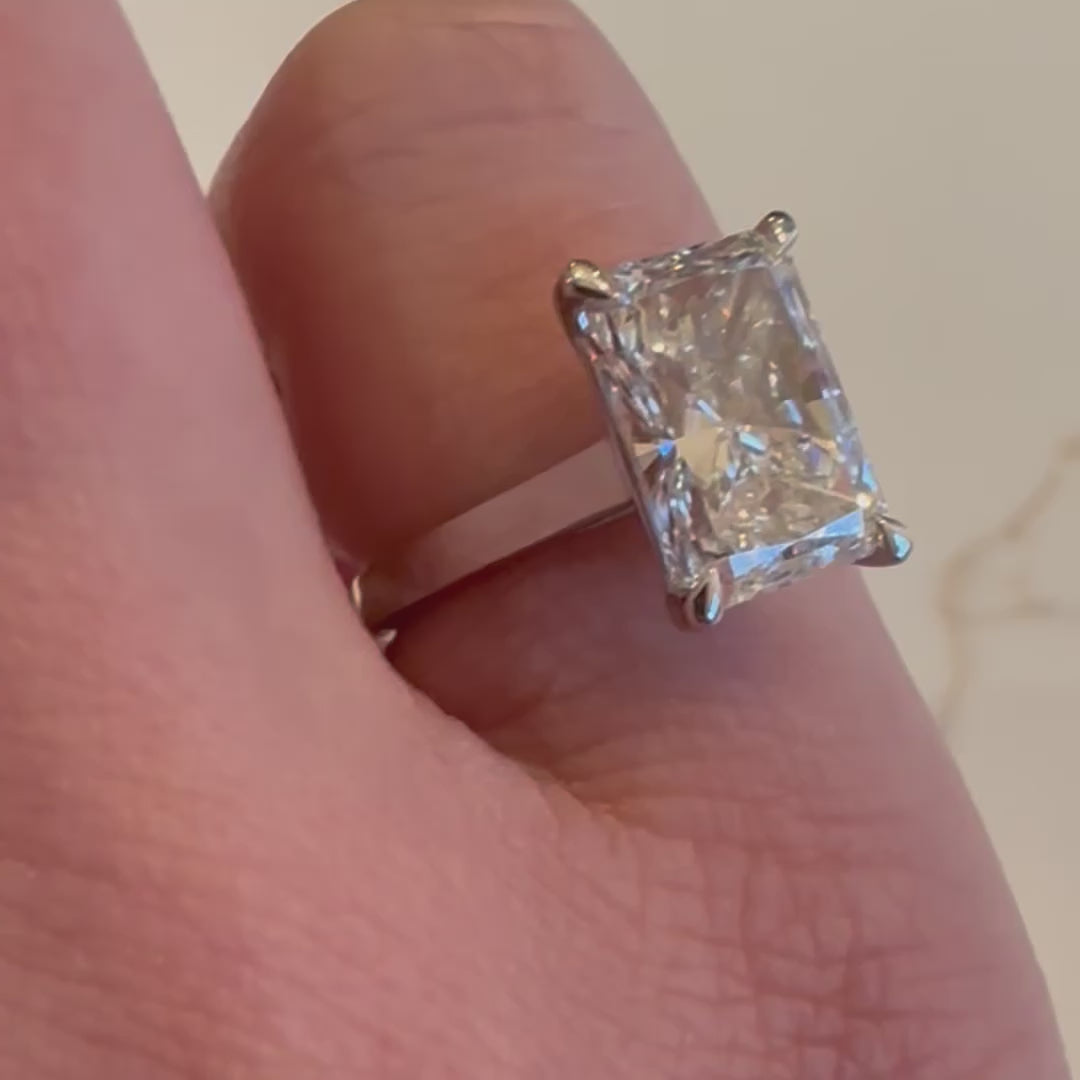 Beautiful three carat lab diamond rectangular brilliant cut ring. The ring is an impressive three carat set in a classic platinum four claw setting on a plain polished band.