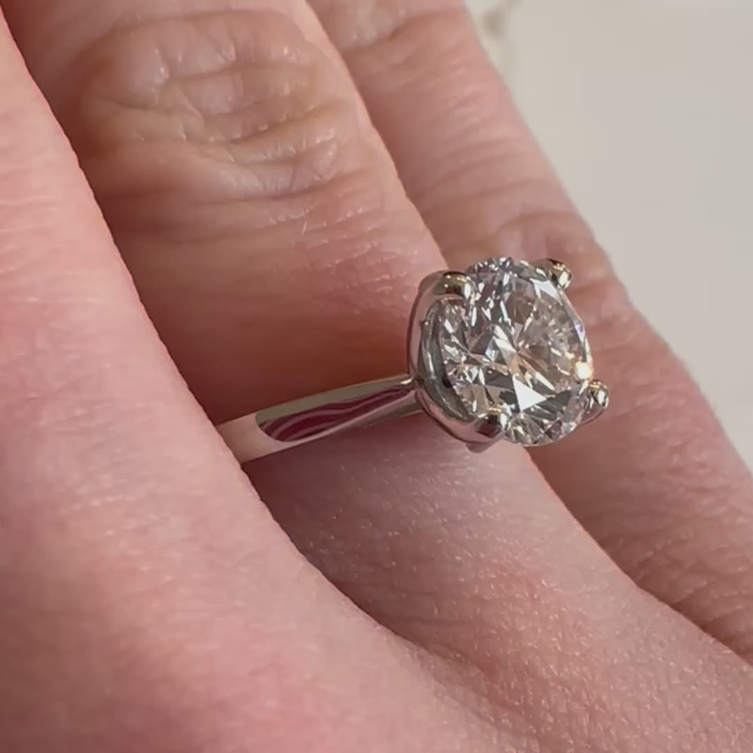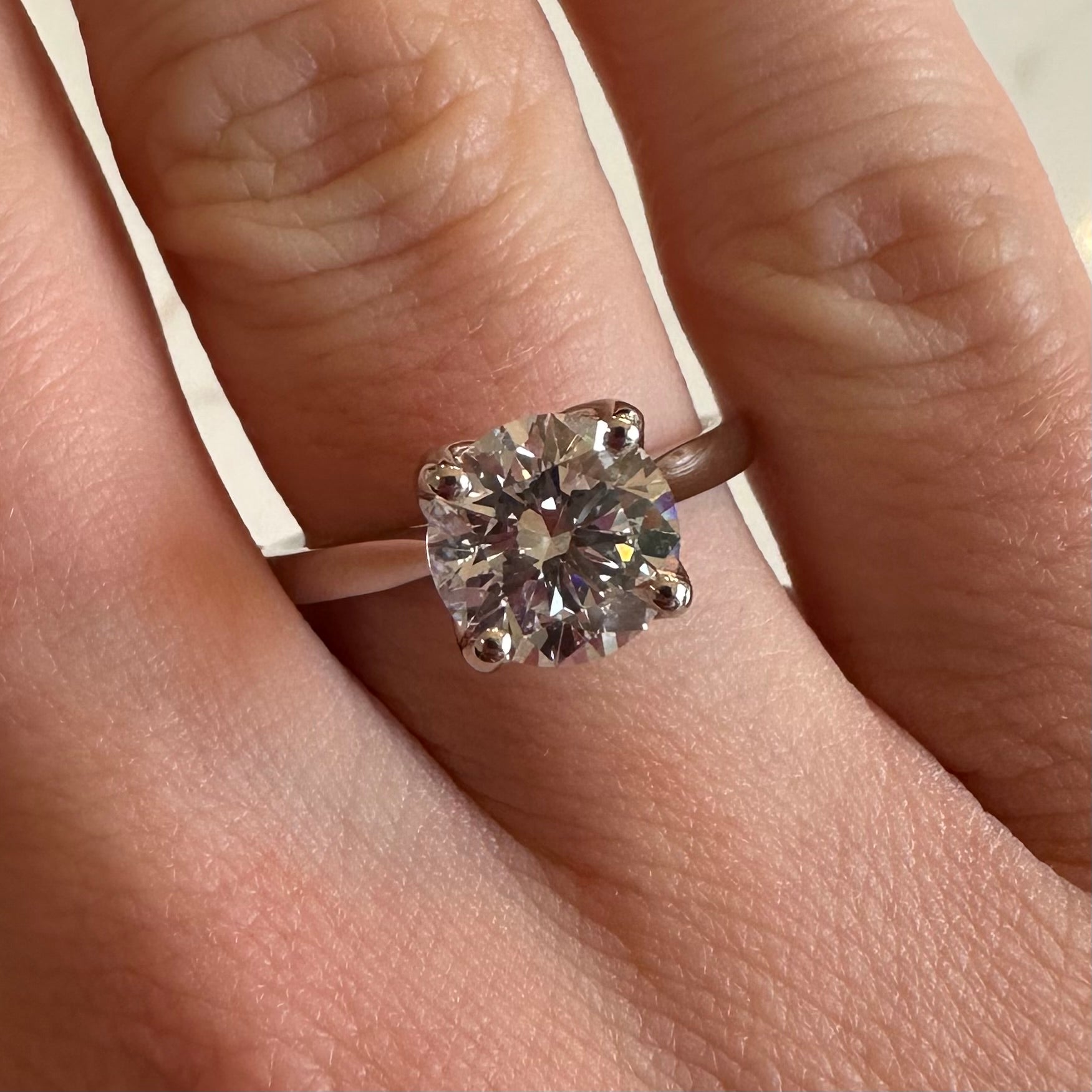 Beautiful platinum round brilliant cut two carat lab diamond ring. Set in a classic scoop claw setting on a plain polished platinum band.