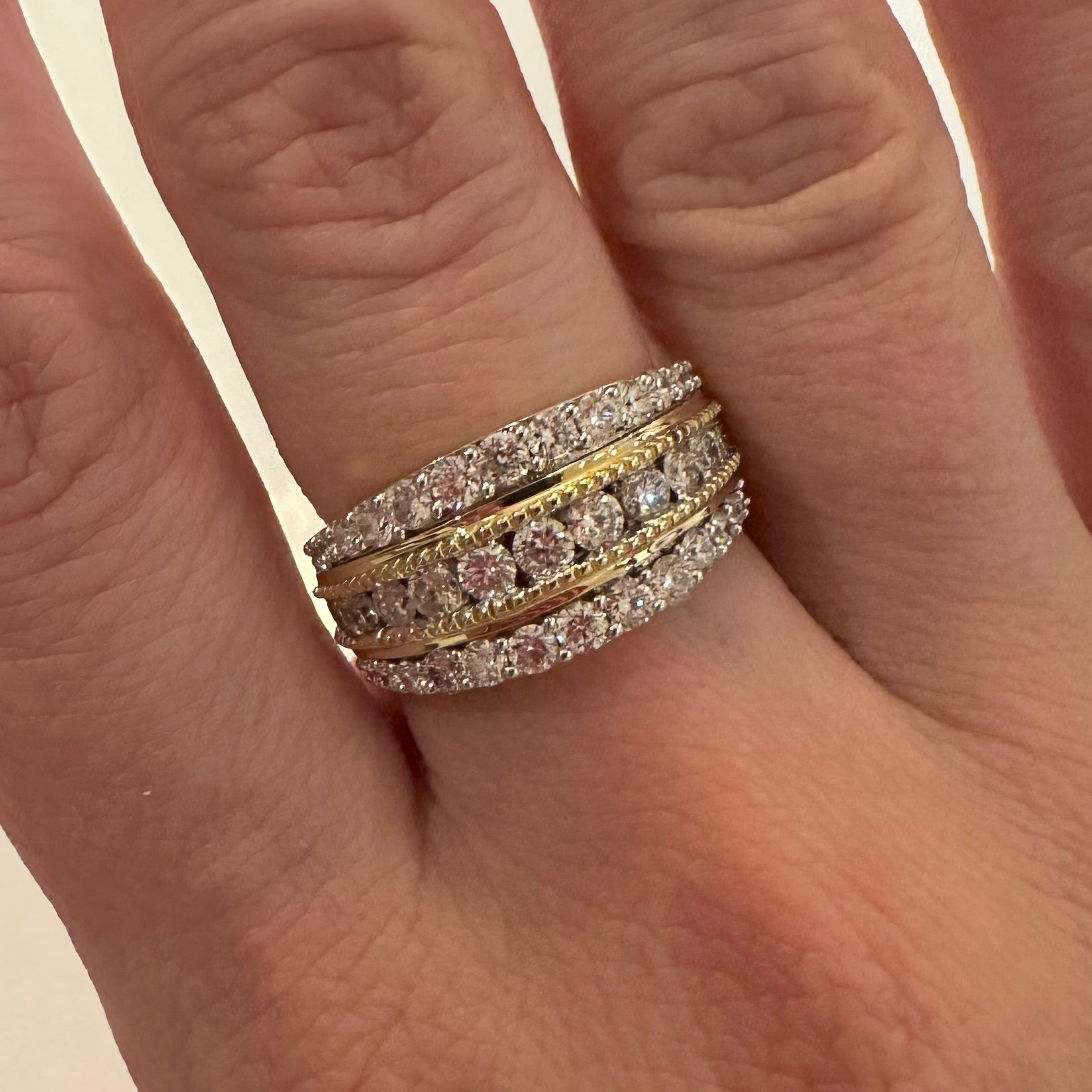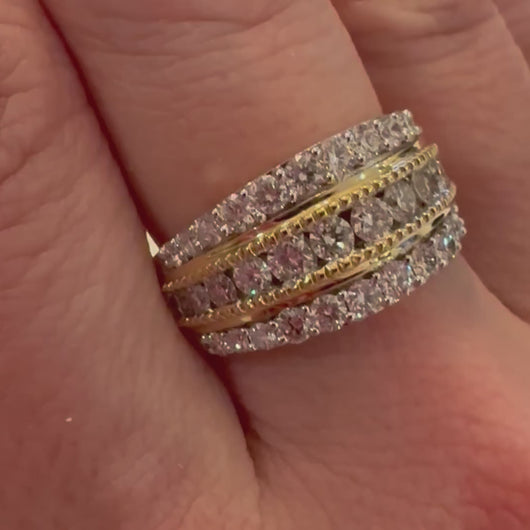 Beautiful diamond band ring. The ring consists of 1.50ct of round brilliant cut diamonds across three rows. There are two rows of yellow gold beaded edge detailing between the diamond rows. The diamonds finish half way and there is a plain polished band at the back of the ring.