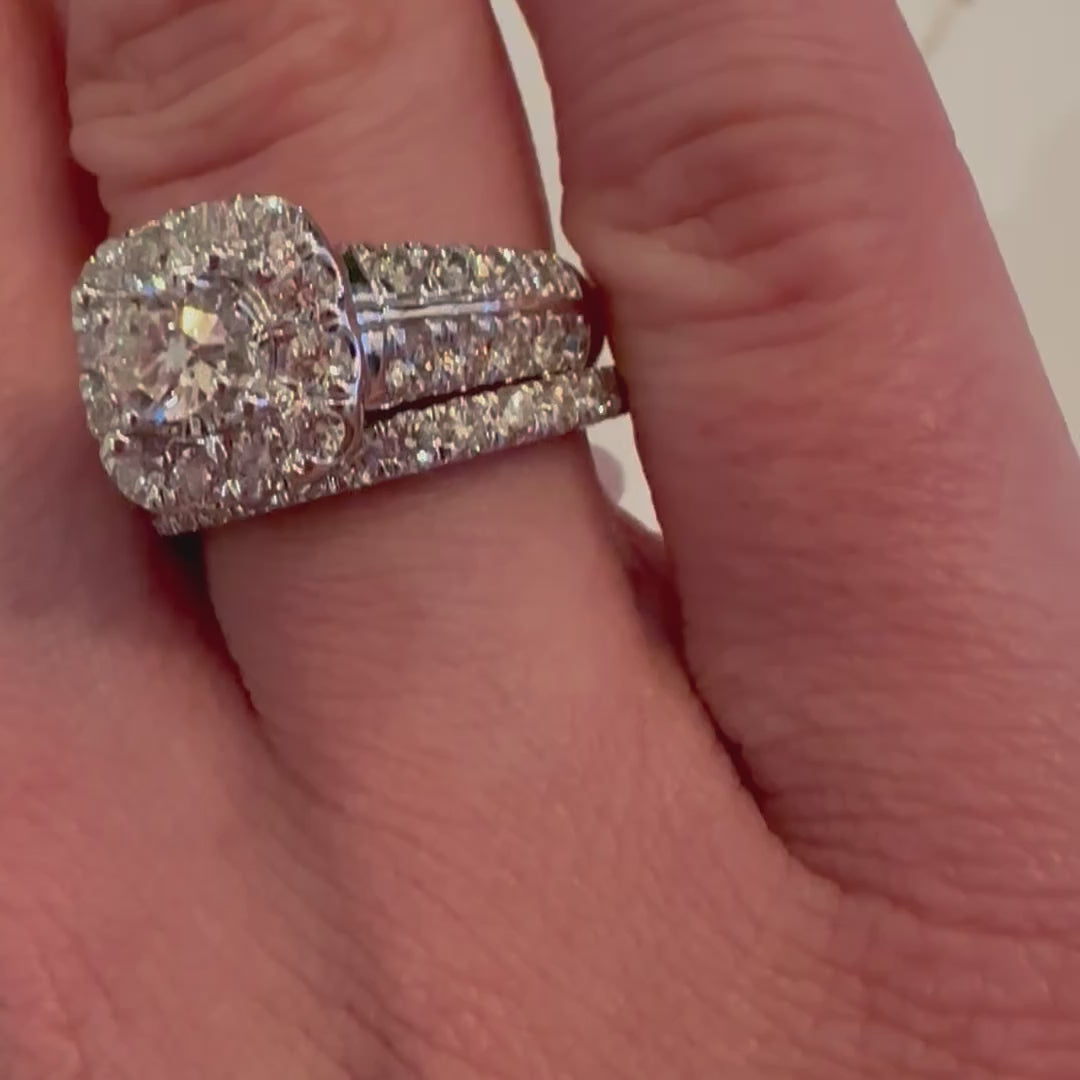 The rings consist of round brilliant cut diamonds forming a cushion shape with a halo design to the engagement ring with a double row diamond band finishing half way down the band. With the perfect matching half claw set diamond band.