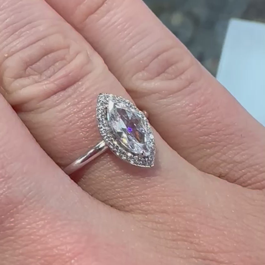 central marquise cubic zirconia surrounded by smaller white cubic zirconias in a white gold claw setting on a plain polished white gold band